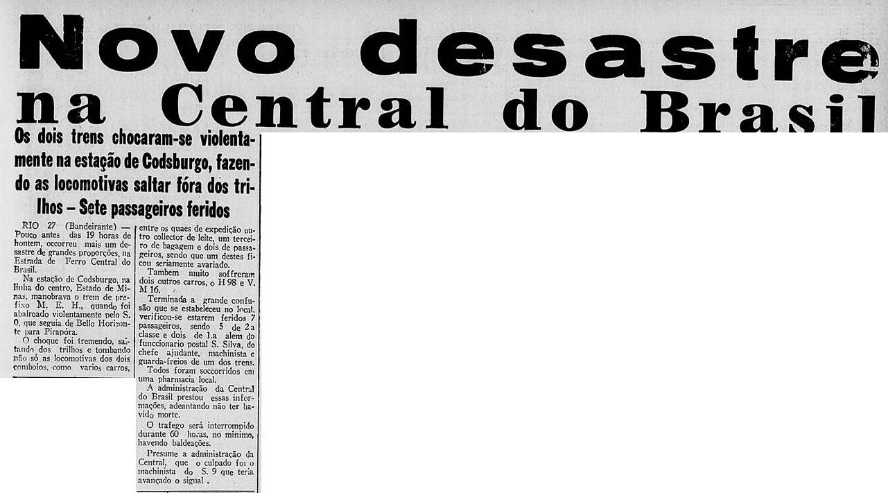 ACIMA: Choque de locomotivas na estação de Cordisburgo, em 1936, aqui escrita como "Codsburgo" - CLIQUE SOBRE O TEXTO PARA LER A REPORTAGEM TODA (Correio de S. Paulo, 27/6/1936).