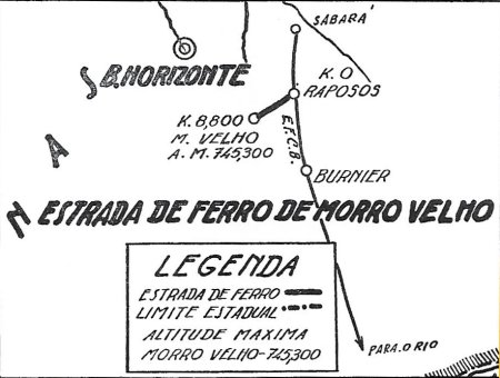 ACIMA: Mapa da E. F. Morro Velho partindo da estação de Raposos em 1954 (I Centenario das ferrovias brasileiras, 1954, p. 34).