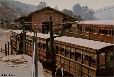 ACIMA: Bonde em Raposos em outubro de 1963 (primeiro plano). Ao fundo, a estação e o trem de suburbios da EFCB à direita (Fort Eric Clark, cessão Rogerio Nascimento).