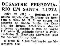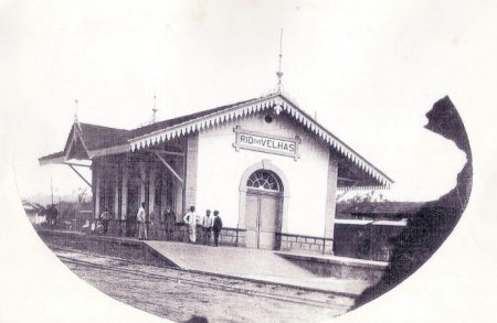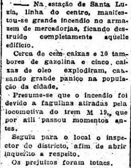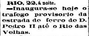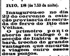 AO LADO: A estação será inaugurada com o nome de Rio das Velhas no dia 22 de.janeiro - há erro no tempo do verbo, no texto do jornal. O número 18 mostra que a nboiticia foi dada nesse dia. A estação de Itabira (Itabira do Campo) é a que depois se chamou Itabirito (O Estado de S. Paulo,