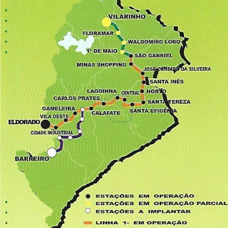 (ACIMA: Estação de Barreiros e as linhas do Demetrô em outubro de 2002. A estação ainda não havia sido implantada. Até 2022 pelo menos a situação estava inalterada (Mapa das linhas do Demetrô, BH).