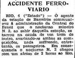 AO LADO: Acidente próximo à estação atrasa o trem noturno BH-Rio (O Estado