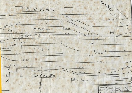ACIMA: Mapa de linhas no pátio da estação da Central do Brasil em Belo Horizonte em 1941 (apenas citada como "estação", na parte baixa do mapa. Na parte alta, está grafado "R. M. Viação,, ou seja, a estação era a da RMV. No mapa emitido pela Central do Brasil, portanto, há linhas das duas ferrovias. CLIQUE SOBRE O MAPA PARA VER EM MAIOR RESOLUÇÃO.