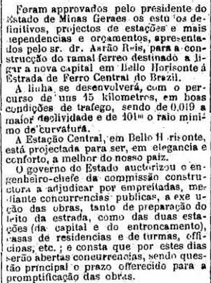 AO LADO: Autorização para concorrencia para a construção das estações de Belo Horizonte e a de General Carneiro (O Estado de S. Paulo, 1/7/1894). |
