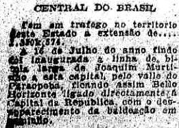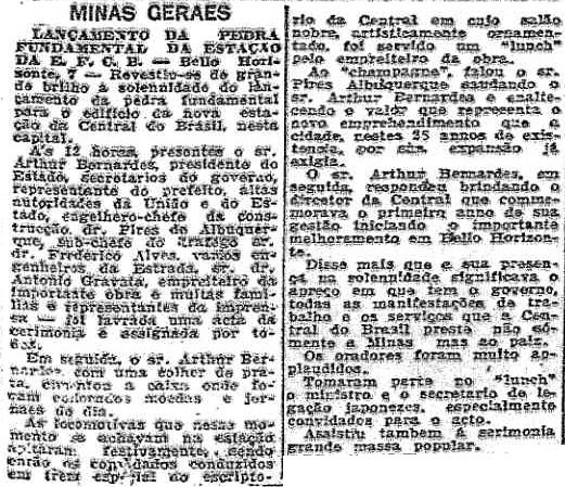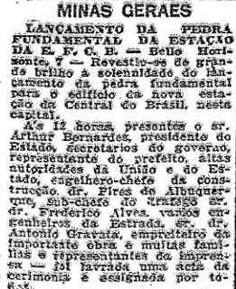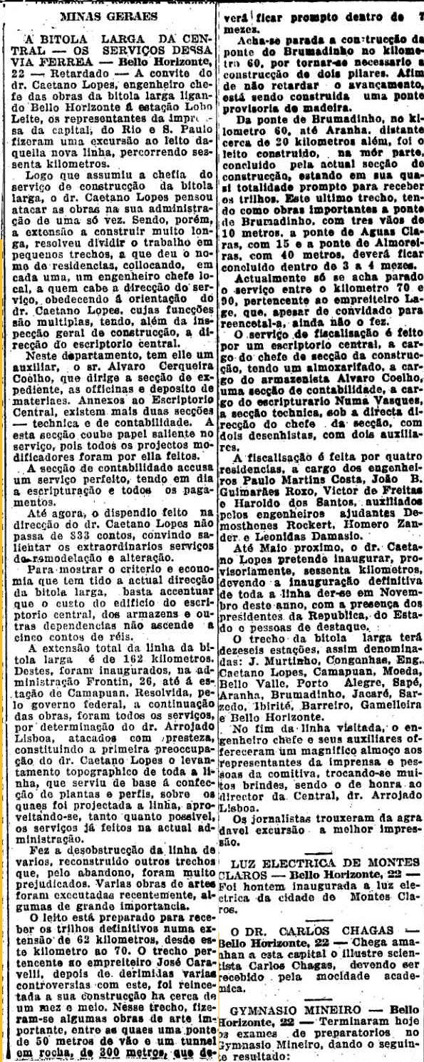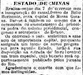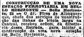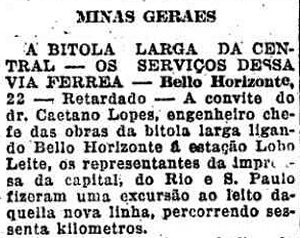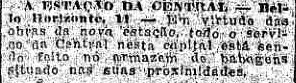 AO LADO: Abertura do tráfego para Belo Horizonte em 1919 (O Estado de S. Paulo, 23/4/1920). |