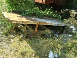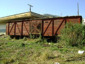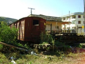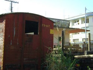 ![]() ACIMA: estacionamento de vagões. Ao fundo, vagão de madeira abandonado. |