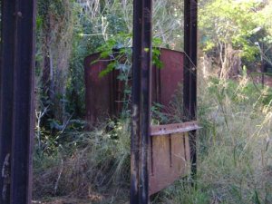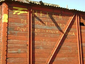 ![]() ACIMA: Vagão # FB-447 abandonado com descrições nas laterais. |