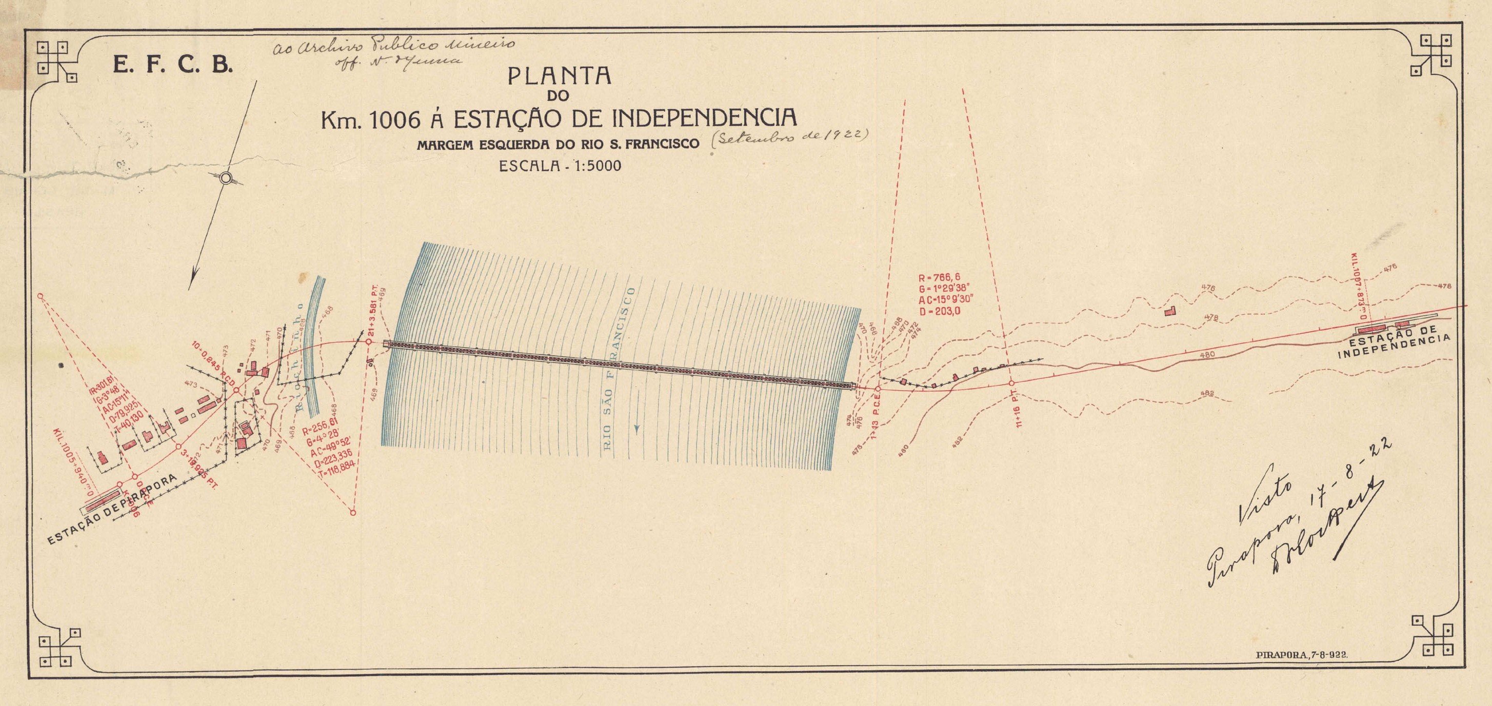 com a grande ponte ferroviária sobre o rio São Francisco.