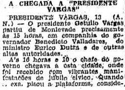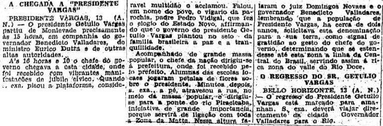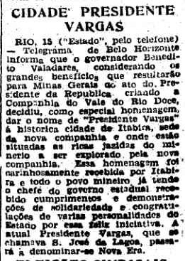 LADO: Bastante confuso: a cidade de Itabira passava a se chamar Presidente Vargas (e depois, em 1947, voltaria a se chamar Itabira). Enquanto isto, a outra cidade, São José da Lagoa, que se chamou Presidente Vargas por poucos anos, voltava a se chamar Nova Era, como era antes (Artigo ao lado de O Estado de S. Paulo, 16/6/1942). |