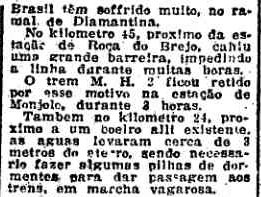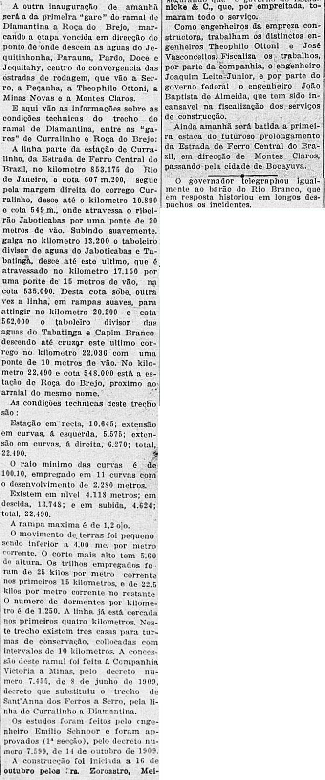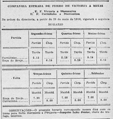 ACIMA: Horarios do novo trem Curralinho (Corinto) - Roça do Brejo e vice-versa em 1910, a partir de 28 de maio (O Paiz, RJ, 27/5/1910).