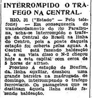 À ESQUERDA: Cai uma barreira junto à estação de Bonfim (O Estado de S. Paulo, 1/1/1946). |