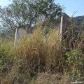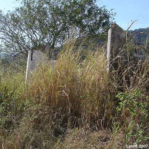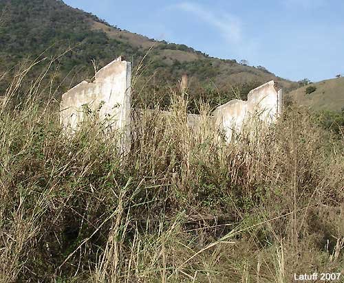 Ruínas cobertas de mato alto, numa pastagem cercada de arame farpado,