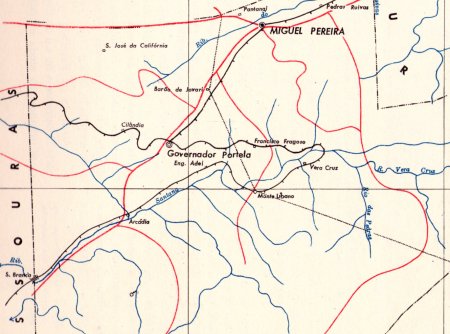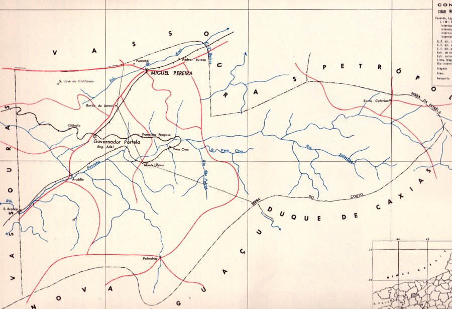 ACIMA: A estação e cidade de Miguel Pereira ao norte no mapa (CLIQUE SOBRE A FIGURA PARA VE-LO MAIOR) (IBGE: Enclopedia dos Municipios Brasileiros, 1960).