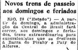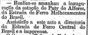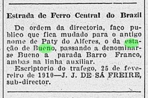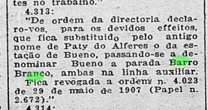 AO LADO: A nota foi publicada em 4.3.1910 pela Gazeta de Noticias. Ela informa que pela ordem 4.313 a estação da cidade volta ao nome anterior de “Paty do Alferes”. Também que o nome “Bueno” agora passa a renomear a parada Barro Branco mais adiante na linha. (Volto a esse bueno mais adiante). Essa nota foi publicada em várias folhas. A da Gazeta acima me parece a mais completa e oficial e, além disso, traz uma segunda e importante informação: “fica revogada a ordem 4.023 de 29.05.1907 Que ordem seria essa? Só pode ser a que mudou o nome da estação. Portanto, agora sabemos também a data da primeira mudança (Foto e texto cedido por Paulo Novaes). |