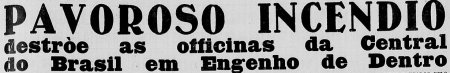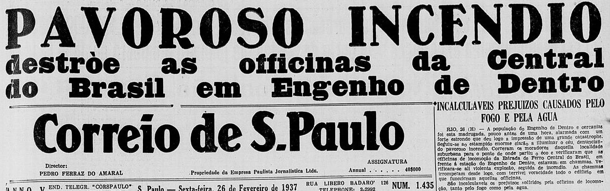 ACIMA: Incêndio destrói as oficinas em Engenho de Dentro em 1937. CLIQUE SOBRE A FIGURA PARA VER A REPORTAGEM INTEIRA (Correio de S. Paulo, 26/2/1937).