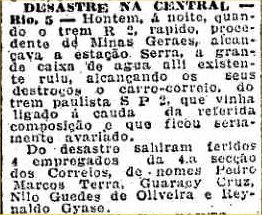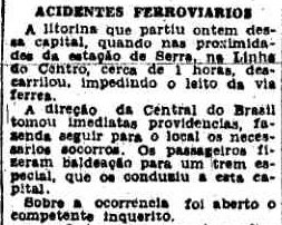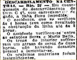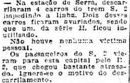 AO LADO: Acidente próximo à estação de Engenheiro Gurgel, então ainda chamada de Serra fez com que os carros desgovernados somente fossem parar cerca de 12 km morro abaixo, na estação de Ellison (e não Heller, como está na notícia (O Estado de S. Paulo, 4/3/1905). |