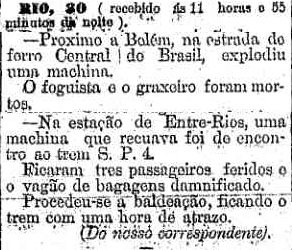 AO LADO: Acidente na estação de Entre Rios. E outro em Belem (Japeri) (O Estado de S. Paulo, 31/1/1897) |