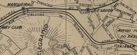 ACIMA: Mapa sem autor e data conhecidos, que mostra as três linhas que passavam pela Mangueira na época e, no lugar da Mangueira (à esquerda no mapa), trÊs estações, uma para cada linha.