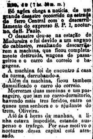 AO LADO: Atropelamento na Mangueira por um trem da Leopoldina (O Estado de S. Paulo,