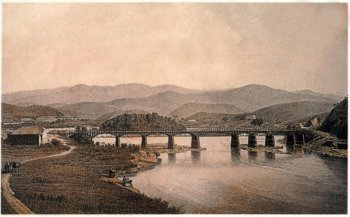Acima, placa da ponte do Desengano em 2006 e a ponte, sem data