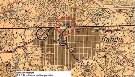 ACIMA: Estação (circulo), ferrovia (linha preta), estrada principal (em rosa) e bairro de Bangu, sem data (Autor desconhecido).