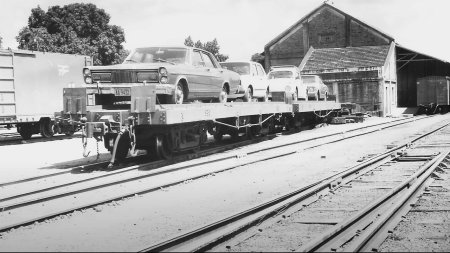 ACIMA: Vagão carregado de automóveis novos na estação de Campo Grande, nos provavelmente anos 1970 (Autor não identificado).
