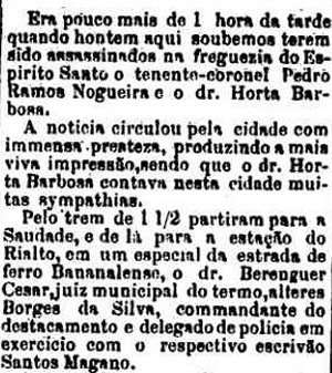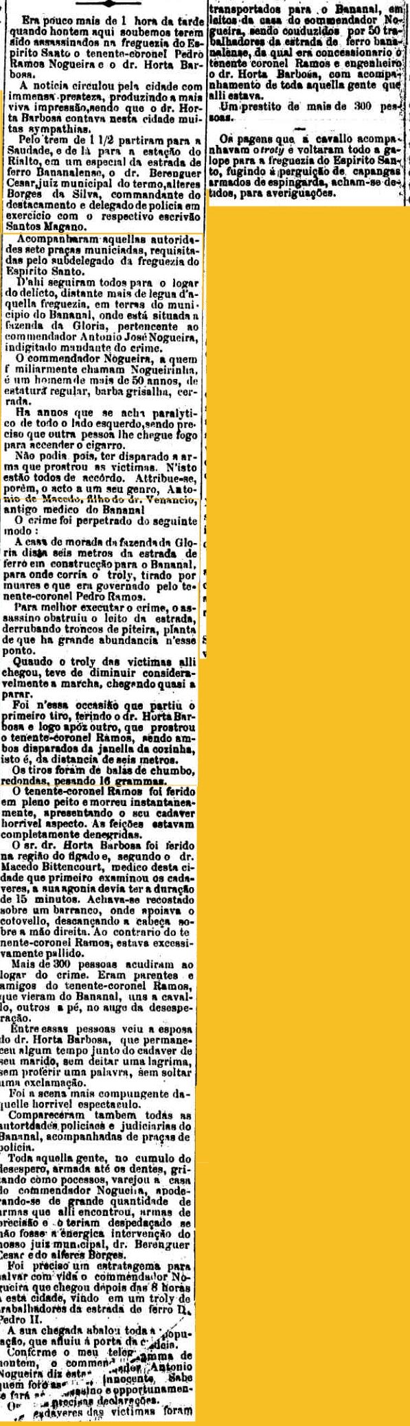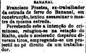 AO LADO: Assassinato em Bananal - a plícia foi investigar, mas o trem, que vinha do Rio e tinha de fazer baldeação em Saudade, ainda chegava somente até Rialto, para Bananal tinha-de ir por outros meios... (CLIQUE SOBRE O ARTIGO PARA VÊ-LO NA INTEGRA(A Provincia