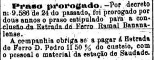AO LADO: Divisãp de custos entre a EFCB e a EF do Bananal na estação de Saudade (A Provincia de S. Paulo, 5/5/1886). |