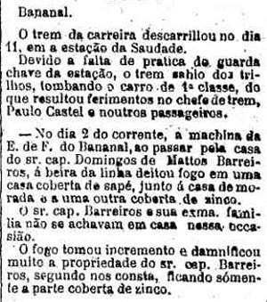 AO LADO: Acidente na estação de Saudade e mais outro, não identificado o local, mas certamente já no ramal para Bananal (O Estado de S. Paulo, 17/1/1894). |
