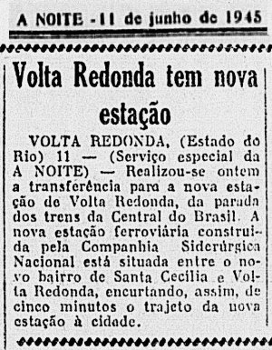 ACIMA: A nova estação de Volta Redonda recebe o pessoal e as instalações em 1945 (A Noite, 13/3/1945).