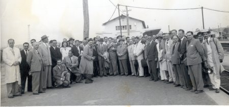 ACIMA: Em 30 de janeiro de 1957, o primeiro trem elétrico a chegar a Volta Redonda vindo do Rio de Janeiro. Como na outra foto mais acima, a estação que aparece é a que foi demolida em meados dos anos 1970 para a expansão da CSN (Do jornal "O Lingote", de janeiro de 1957).