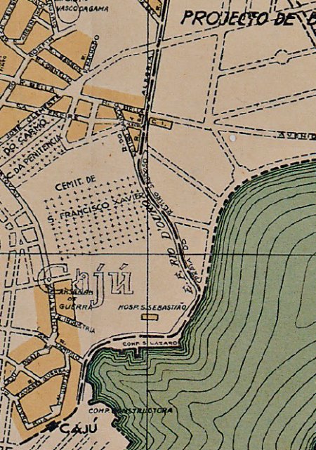 ACIMA: Mapa de 1929 mostrando a estação do Caju, a rua Alegria e a rua Bella (ambas eram nome de estações da linha) e ainda o Cemitério de São Francisco Xavier (também estação com o nome de São Francisco) As quatro estações devem ter sido desativados exatamente nesta época. A localização delas não consegui (Mapa - Guia Briguet, planta do Rio de Janeiro de 1929).
