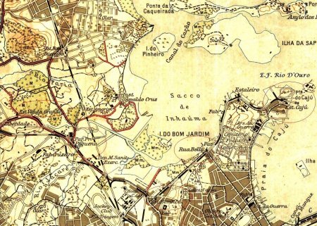 ACIMA: Mapa do que teria sido a Estrada de Ferro Rio De Ouro durante sua existência, do final do século XIX até por volta de 1970. A linhas-tronco original e seus ramais nunca conviveram ao mesmo tempo, o que torna obrigatório a existência com praticamente uma cor para cada linha no desenho. A cor roxa escura teria sido a linha-tronco original, ligando Caju a Jaceruba e a linha verde foi construída para mudar o ponto zero de Francisco Sá a Engenho do Mato. No final dos anos 1920, o trecho que ligava o Caju â região de Belfort Roxo foi extinto e substituído por outro percurso, numa época que, por existirem diversas fontes diferentes e conflitantes entre si (Desenho: Eduardo P. Moreira, durante os anos 2010). NOTA IMPORTANTE. As estaçõea de Capivary (que se situava no ramal de Xerém, entre Lamarão e Quilômetro 43 e o ramal de Gairão, que saía de João Pinto, embora apareca neste mapa, não foram por mim encontradas em documentação alguma.