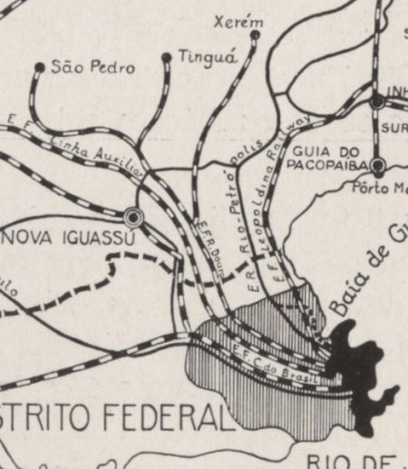 ACIMA: Jaceruba, ainda chamada de São Pedro), Tinguá e Xerem, as três estações terminais da E. F. Rio de Ouro em 1941). Aparecem também outras ferrovias (em linhas branca e preta , intermitentes) e rodovias, em linhas tradejadas(Mapa da Revista Brasileira de Geografia, 04/07/1941, página 375).