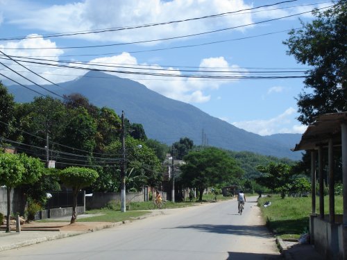 Cava, município de Nova Iguaçu, RJ Acima, vista da Vila de Cava, tendo ao fundo a Serra do Tinguá, em 2006 . A rua que se vê é o antigo leito da ferrovia, sentido São Pedro (Foto Flávio Farias de Araujo).