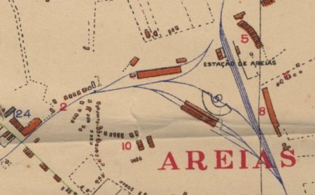 ACIMA: No mapa de 1932, esquema da estação, ainda chamada de Areias no desenho, armazéns,