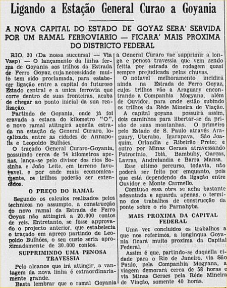 Goiania. No fim das contas, essa ligação jamais existiu: a ligação por trilhos para Goiania foi finalmente construída como um prolongamento da linha-tronco da EFG e ficou pronto em 1950 (Correio Paulistano,