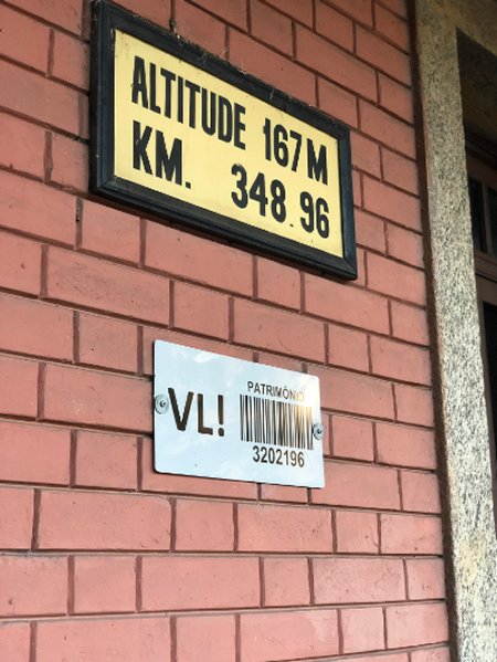 ACIMA: Placa de quilometragem existente na estação de Cataguases em 23 de junho de 2019. Reparem que é diferente em cerca de dois quilômetros da quilometragem existente em 1960 (no topo deste página) e que é citada no Guia Geral de 1960. O moitvo desta diferença é realmente difícil de se saber, mas quem se importa? (Foto Felipe Medeiros de Tavares em 23/6/2019).