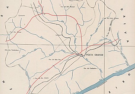 ACIMA: Mapa dos anos 1950 mostrando a estação de Volta Grande. A linha que vem do sul e sobe para o norte passando por Volta Grande é a linha do Centro da Leopoldina. A que segue para leste é o ramal de Pirapetinga