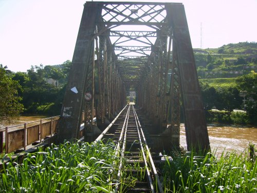 ponte ferroviária (ainda com os trilhos) sobre o rio Piranga, aberta
