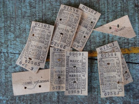 ACIMA: Bilhetes de Niteroi a Itapeteiu e de Maricá a Itapeteiu encontrados na estação de Manuel Ribeiro em 2009. Os billhetes não têm data, mas possivelmente sejam de 1955, época em que a estação teve este nome por um curto período de tempo (Foto Cleiton Pieruccini).