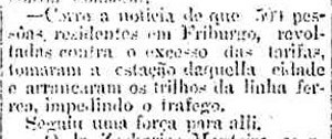 AO LADO: Em 11 de abril, a revolta que havia começado em Friburgo no dia 3 já se estaendia a Porto das Caixas, ponto de encontro da linha do Cantagalo com a linha do Litoral (veja também página para a estação de Nova Friburgo) (O Estado de S. Paulo, 11/04/1900). |