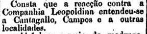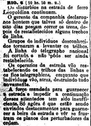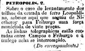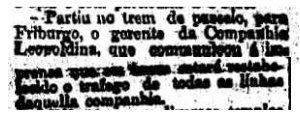 AO LADO: O gerente da Leopoldina segue para Nova Friburgo para tentar liberar todas as linha da Leopoldina depois dos acontecimentos que começaram na cidade havia quase dez dias (O Estado de S. Paulo, 12/04/1900). |