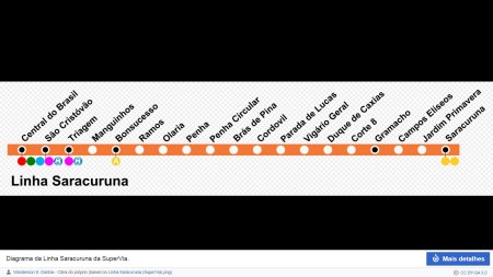 ACIMA: Índice de estações da linha da Supervia em 2023. Notar que, de Triagem aaté Saracuruna (de onde sai o curto ramal até Inhomerim), todas as estações mais antigas estão ainda ativas, com a exceção da de São Bento. Houve também a inclusão da estação de Corte 8 em 2013 (Mapa da Supervia). A estação de São Cristóvao está somente na linha de Japeri e as de Praia Formosa foi desativada em 1925 e Barão de Mauá foi desativada em 2002
