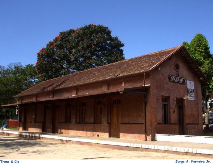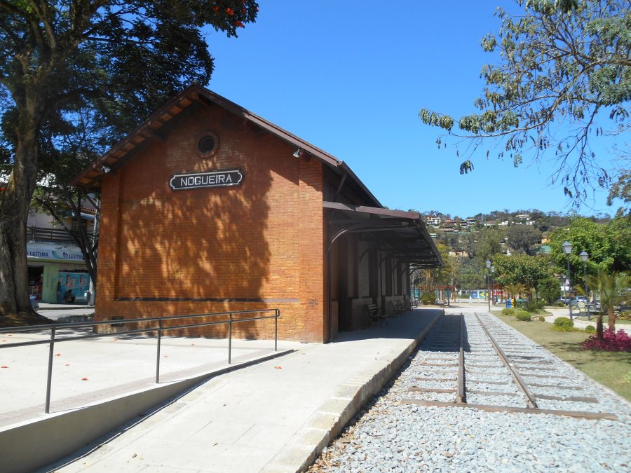 ACIMA: Em 2019, a ex-estação de Nogueira com máquina a vapor e trilhos em frente a ela (Foto Luis L'Aiglon