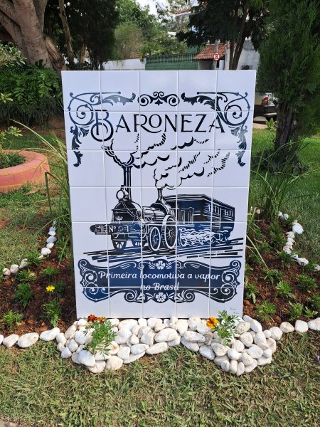 (ACIMA: Placa de azulejos nos jardins da nova estação, colocada em 2023 (Foto: Renato Cabral Ramos).