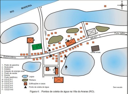 ACIMA: Esquema (sem escala) do bairro de Araras, hoje no município de Nova Mamoré Nota-se que não existe nenhuma menção ao local de onde um dia foi a estação da EFMM, e nem seria preciso: o bairro somente se desenvolveu depois do fechamento da linha e da estação em 1971 - CLIQUE SOBRE O MAPA PARA VÊ-LO EM TAMANHO MAIOR (Arnaldo da Silva, UNESP - Rio Claro, SP: Garimpo do Araras, RO, Depois do Eldorado, 29/11/2002).