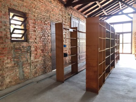 ACIMA: Interior do armazém após restauração depois do incêndio de 2018 (Foto: Estela Becker, em março de 2023).