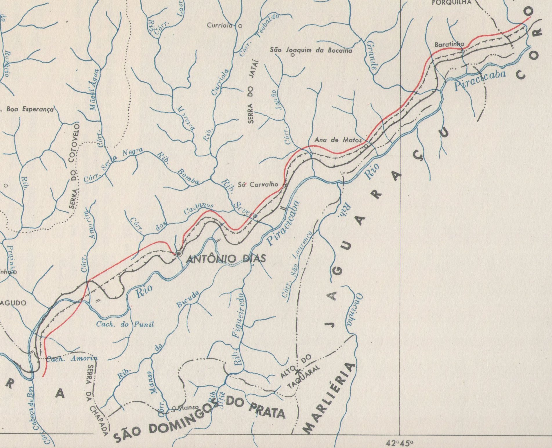 ACIMA: Mapa (parcial) do municipio de Antonio Dias, mostrando oas estações no seu território: Antonio Dias, Ana de Matos e Baratinha nos anos 1950 (IBGE: Enciclopedia dos Municipios Brasileiros, 1960).