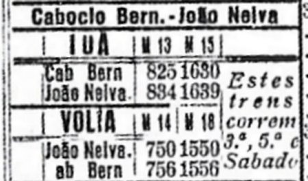 ACIMA: Os trens do ramal de Caboclo Bernardo para João Neiva em julho de 1960 (Guia Levi 07/1960, p. 100).